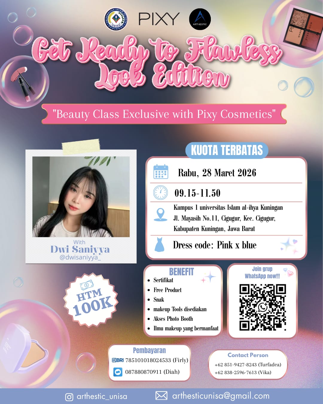Selain kompetisi film, panitia juga bekerja sama dengan Pixy Cosmetic Cirebon untuk menghadirkan sesi Beauty Class eksklusif bagi peserta perempuan. Kegiatan ini akan dipandu oleh beauty expert Dwi Saniyya, yang akan membagikan tips teknik makeup flawless, mulai dari penggunaan base hingga contouring natural, guna meningkatkan rasa percaya diri peserta, baik di depan kamera maupun dalam kehidupan sehari-hari.